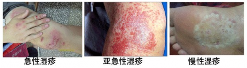 1、急性湿疹:发病急,皮损初为多数密集的粟粒大小的丘疹、丘疱疹或小水疱,基底潮红,瘙痒剧烈。